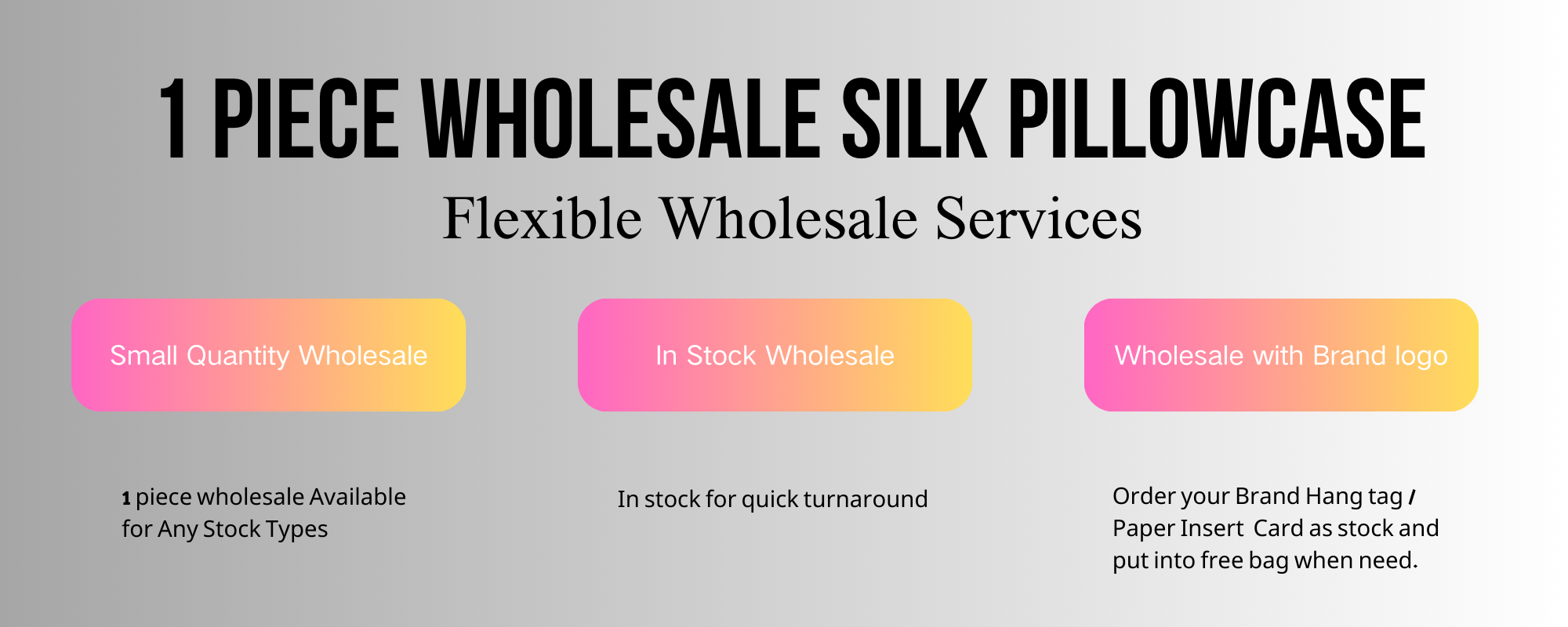 - 1 piece wholesale silk pillowcase - no minimum order quantity. Custom silk pillowcase with brand logo - low minimum order quantity. To learn more, please click on the below each real silk pillow covers link.