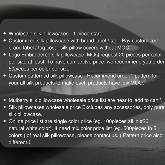 - Below each mulberry silk pillowcase link contains more information - size, color, custom brand tag, logo embroidery, wholesale, price explanation, package customization and so so on. In addition to the natural silk pillowcase types shown on the website, our factory also accepts customized pillowcase silk of different types / colors / patterns, or custom pillow covers silk based on photos or your samples. The Minimum Order Quantity for new products depends on the workmanship of the new products. Free samples are not provided.