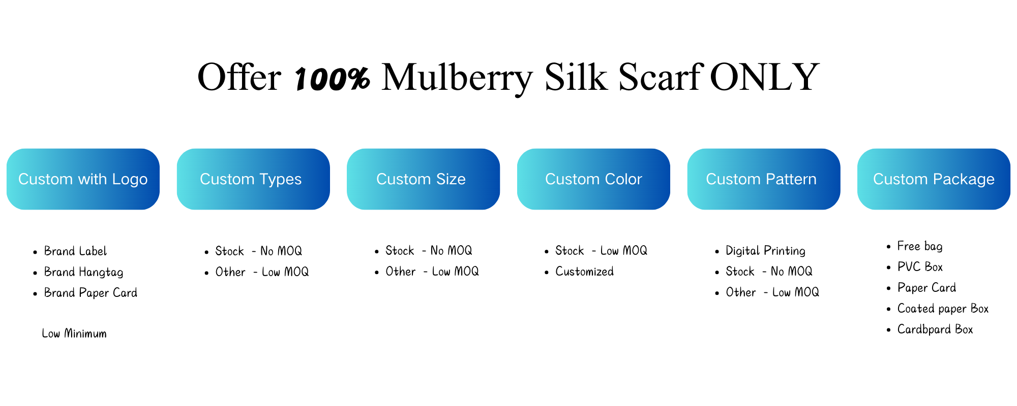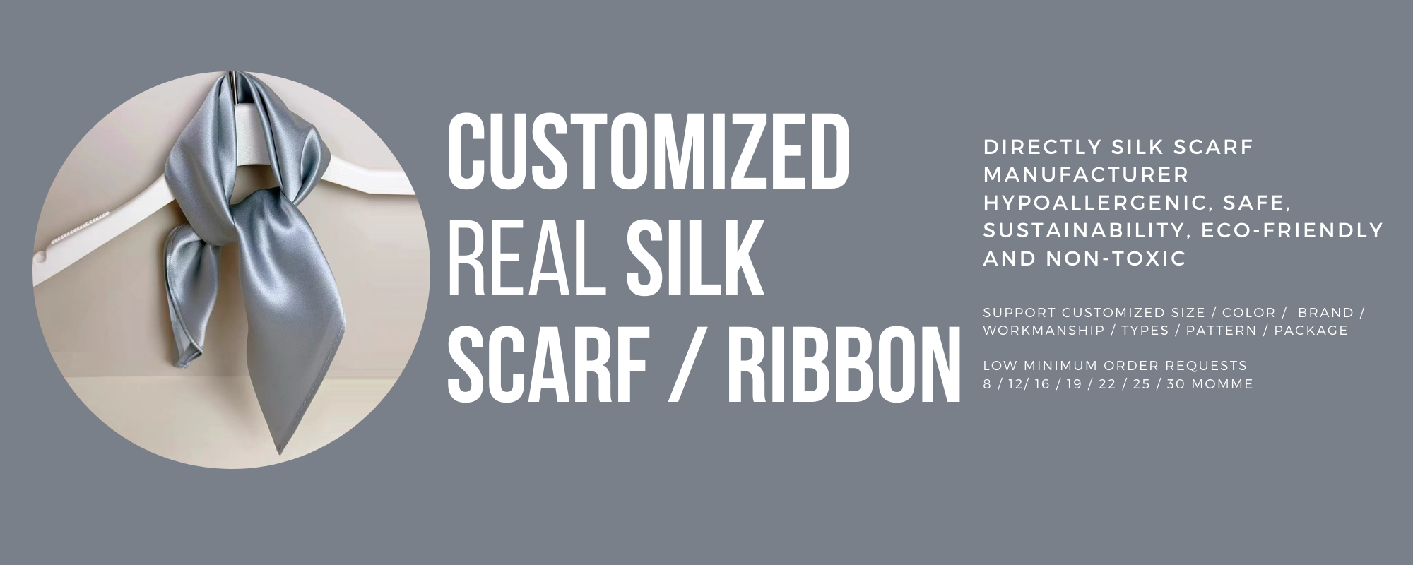 - Below each mulberry silk scarf / silk hair ribbon link contains more information - size, color, custom brand tag, logo embroidery, wholesale, price explanation, package customization and so so on. In addition to the natural silk scarf types shown on the website, our factory also accepts customized silk ribbon / silk scarf of different types / colors / patterns, or custom silk scarf based on photos or your samples. The Minimum Order Quantity for new products depends on the workmanship of the new products. Free samples are not provided.