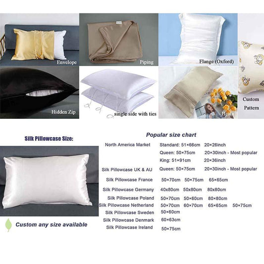 Currently, we produce a variety of silk pillowcase types. In addition to current silk pillowcases types, we also support custom silk pillowcases based on samples or your design.