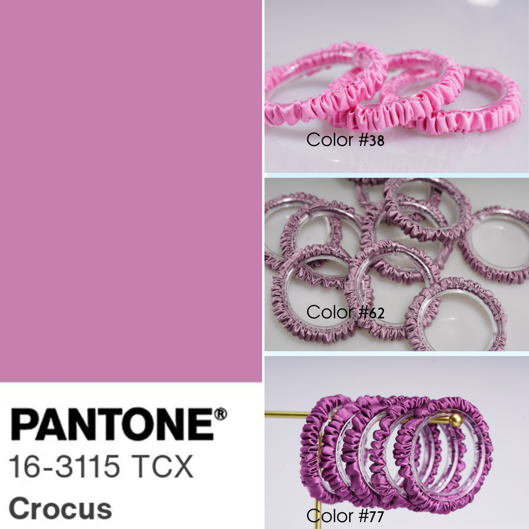 Color #38 Light Rose Pink, #62 Purple lotus and #77 Reddish purple, all are similar to Pantone 16-3115 TCX.