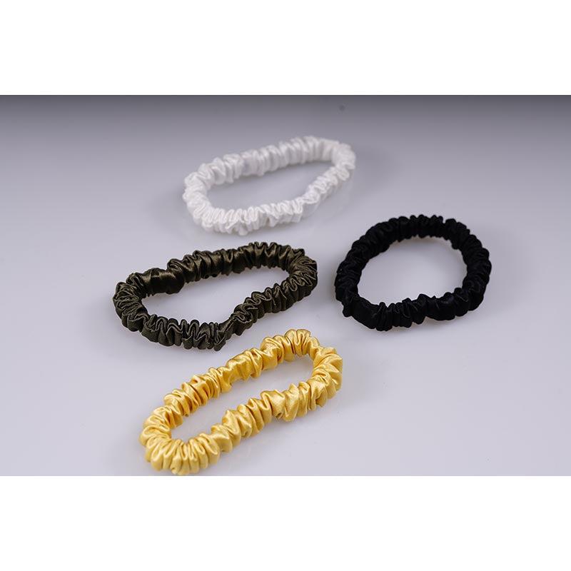 Mulberry silk scrunchies are made from the finest natural fibers in the world - 100% mulberry silk fabric. Silk fibers are care of our hair and skin. Silk hair scrunchies won't cause creases, dents, snagging or breakage in your hair, and real silk scrunchies nourish and moisturize your hair, keeping them bouncy and beautiful. and mini silk scrunchies are slim, suitable for a variety of hair types, and can be used as a stylish alternative to elastic bands.