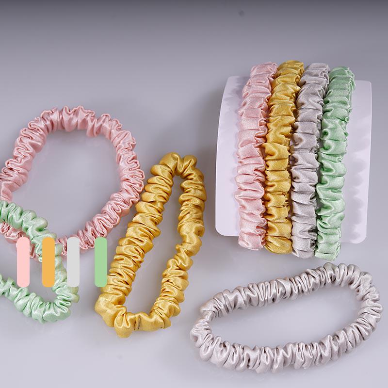 Mulberry silk hair ties are made from the finest natural fibers in the world - 100% mulberry silk fabric. Silk fibers are care of our hair and skin. Silk hair ties won't cause creases, dents, snagging or breakage in your hair, and real silk hair ties nourish and moisturize your hair, keeping them bouncy and beautiful. and mini silk hair ties are slim, suitable for a variety of hair types, and can be used as a stylish alternative to elastic bands.
