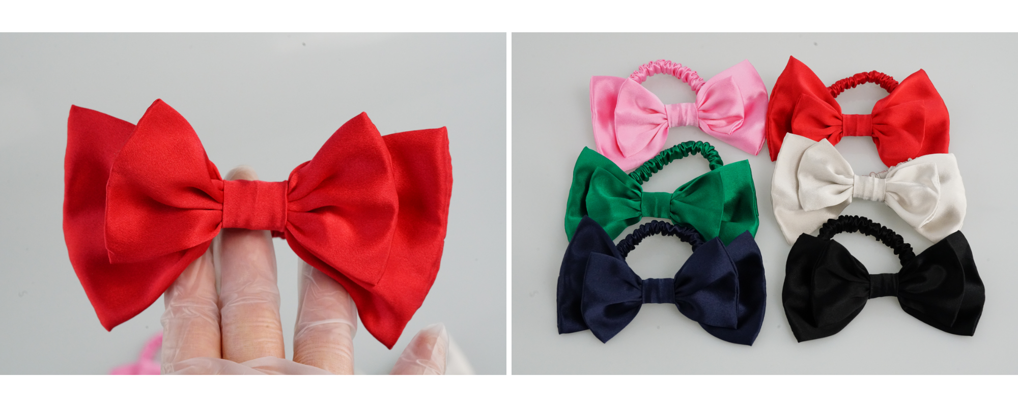At our factory, we specialize in producing high-quality Bow Silk Scrunchies Mini, available in 96 stocked colors and some stocked patterned fabrics. We offer custom orders with low minimum quantities and wholesale options with no minimum order requirements. Our services include custom colors and patterned fabrics to suit your unique brand's needs.