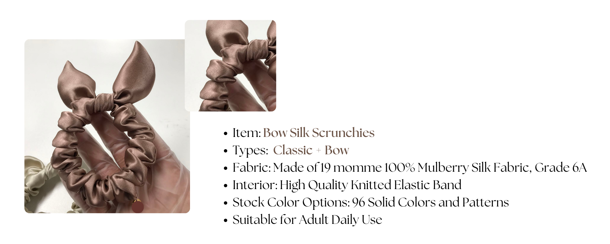 - Types: silk bow scrunchie
