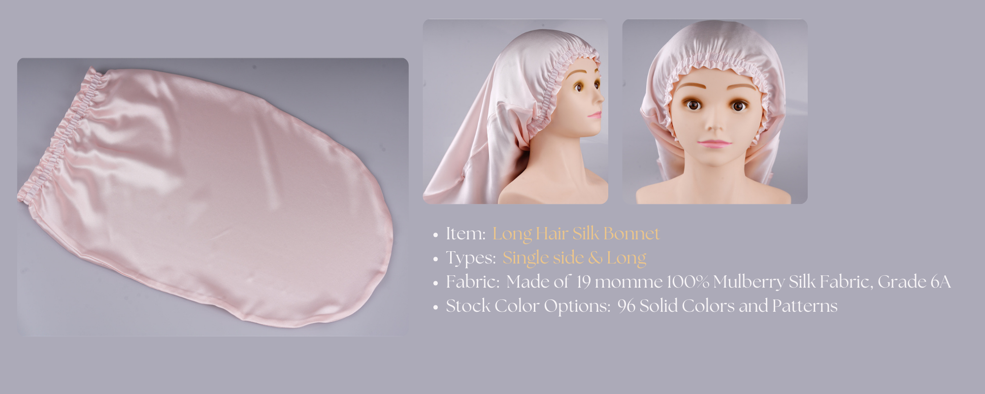 Experience luxury with Long Hair Silk Bonnet Classic Single Side perfect for long hair, crafted from the finest silk in 96 stocked colors. Our service includes custom silk bonnets with low minimum order quantities and wholesale with no minimum order requirements. Custom brand labels, logo embroidery, and printed designs are available for an additional cost.