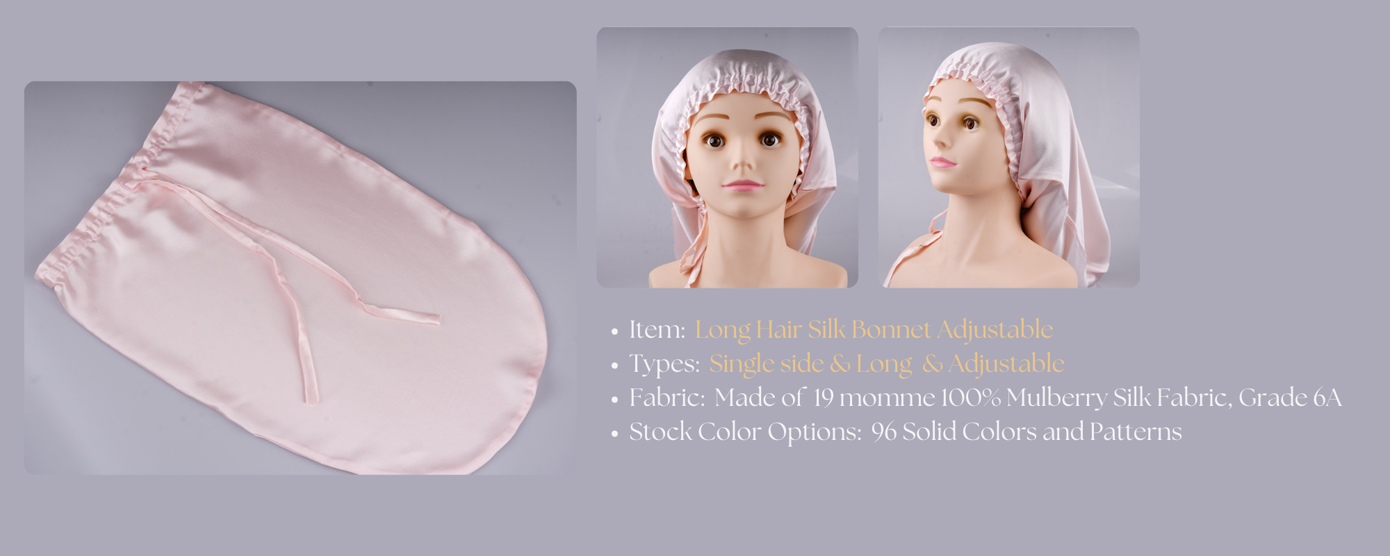 Our Long Silk Bonnet Adjustable is perfect for maintaining your long hair’s health and beauty. Available in 96 colors, these silk hair bonnet for long hair are made from high-quality silk for a luxurious touch. We offer custom silk bonnets with low minimum quantities, silk bonnet wholesale without minimums, and custom brand, package, types and pattern options with extra costs.
