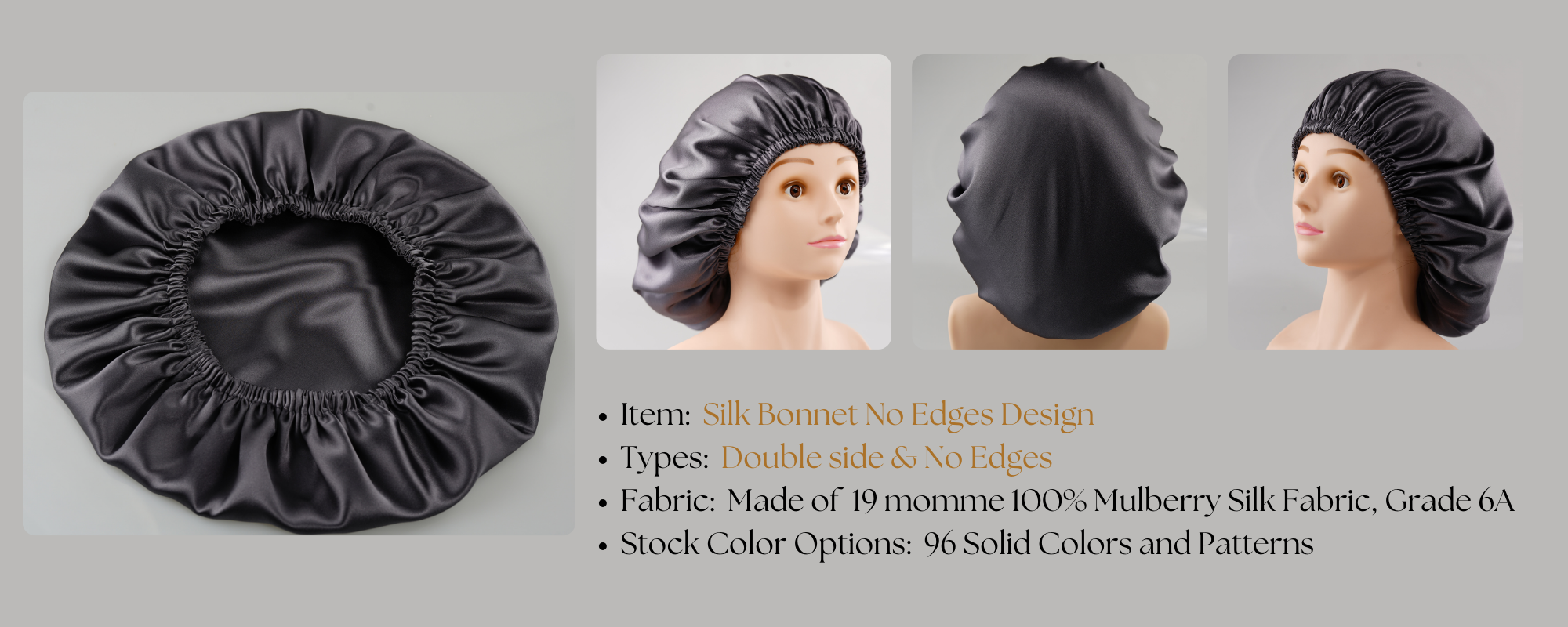 Our Double Lined Silk Bonnet No Edges is designed to provide both comfort and style. Made from luxurious silk, these sleep silk bonnets help maintain your hair’s health and shine. We offer custom silk bonnets with low minimums, mulberry silk bonnets wholesale with no minimum requirements. Also support custom brand tag, logo embraidery, types, pattern options with extral costs.