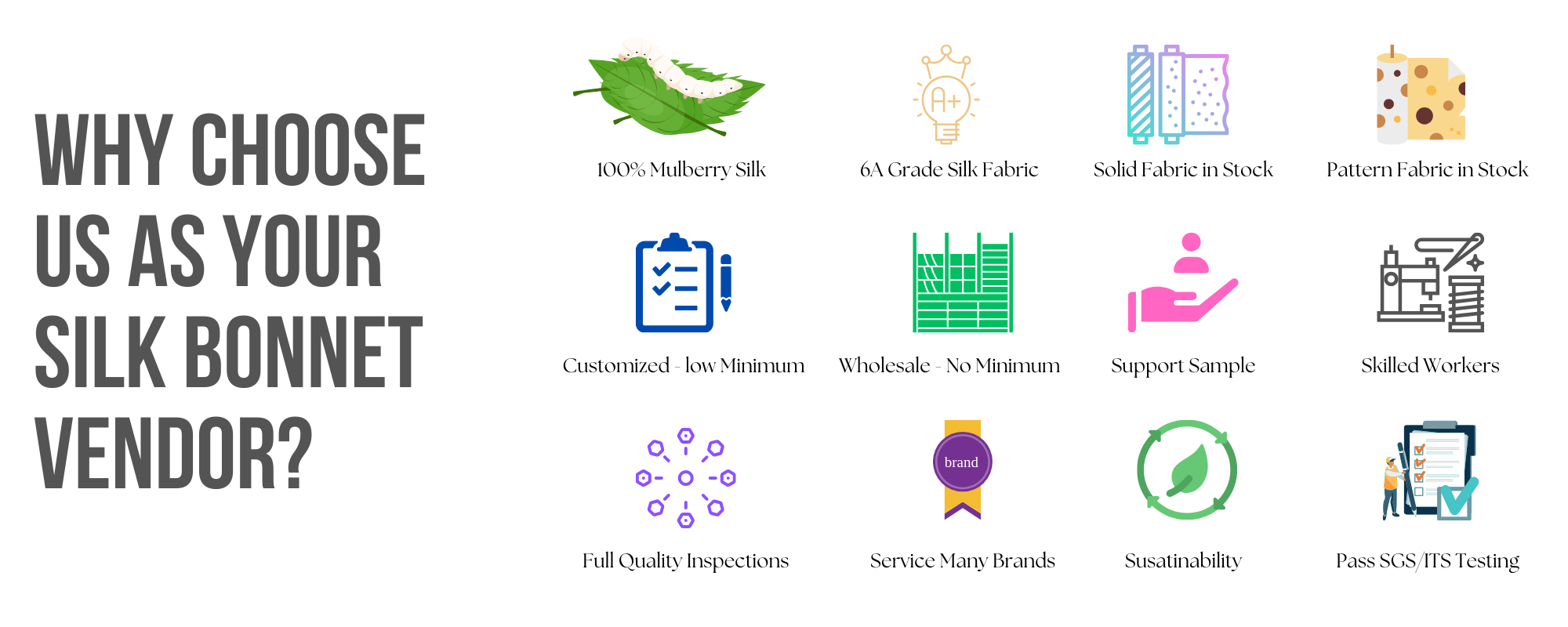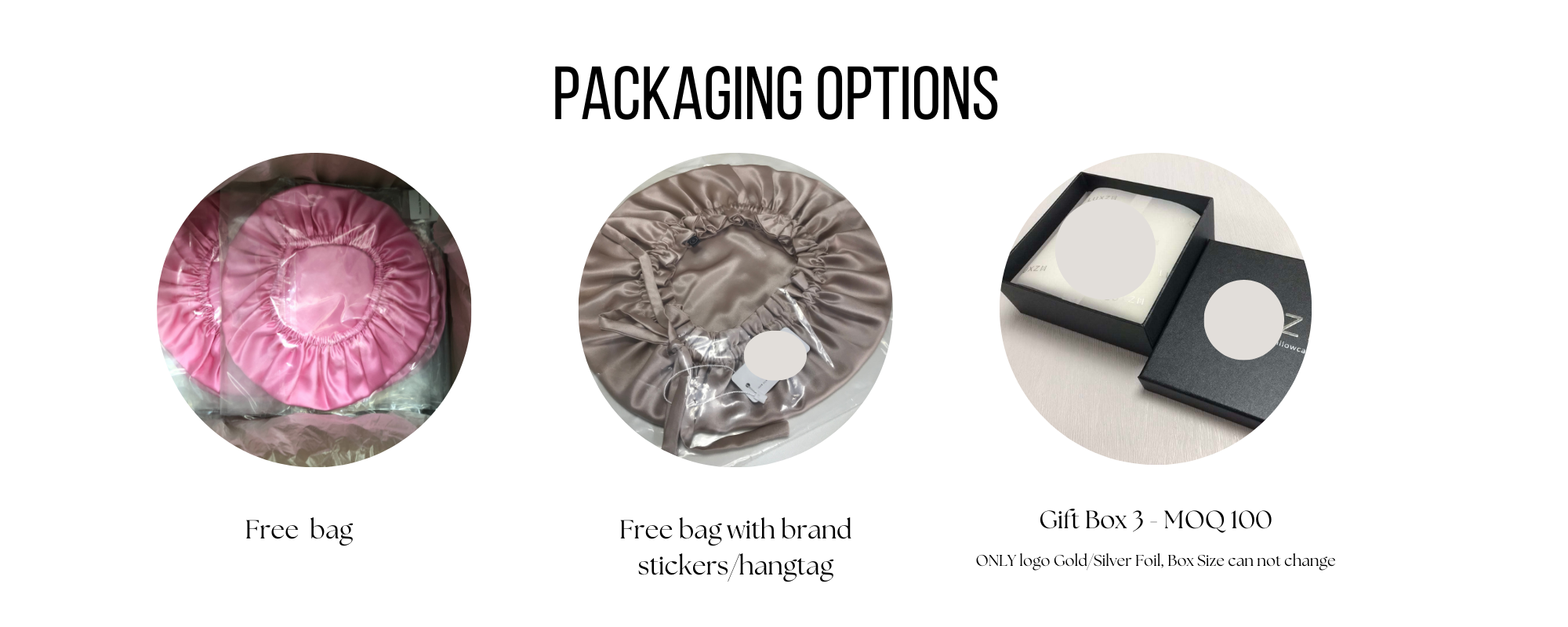 - Custom print silk bonnet : Recommend order 1 pattern for your all silk products to make each products have low MOQ.