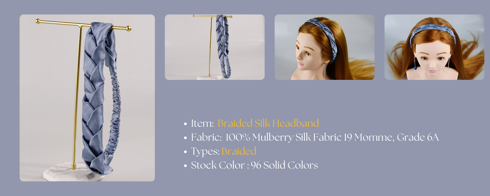 Enhance your style with our luxurious Silk Headband Braided , available in 96 stocked colors. Crafted from premium silk, these silk braided headbands offer unparalleled elegance and comfort. Our services include custom silk headband with low minimum quantities and silk headband wholesale with no minimum requirements. We also provide options for custom brand labels, logo embroidery, and printed designs, with extra costs.