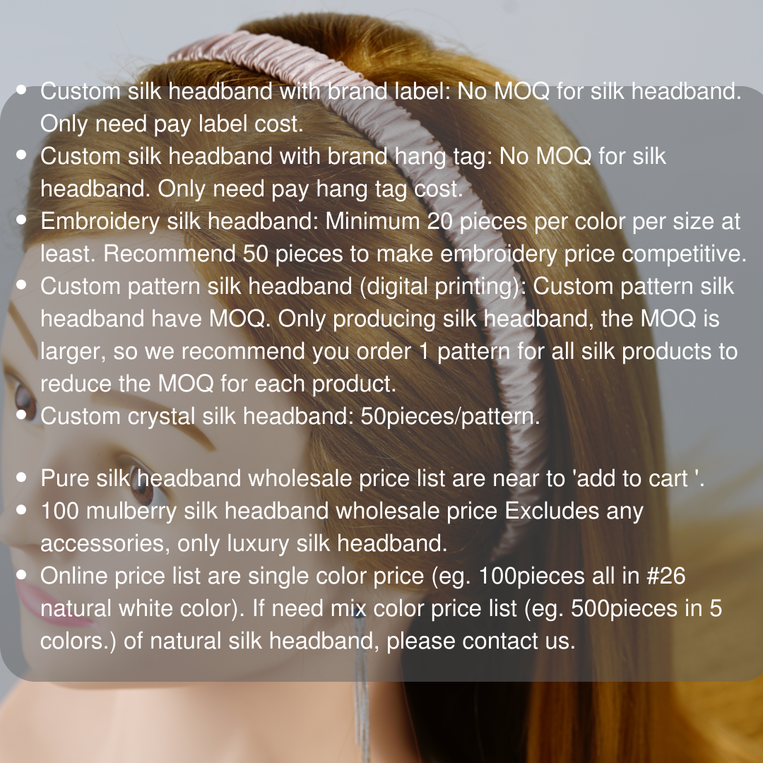 - Custom pattern silk headband : Recommend order 1 pattern for your all silk products to make each products have low MOQ.