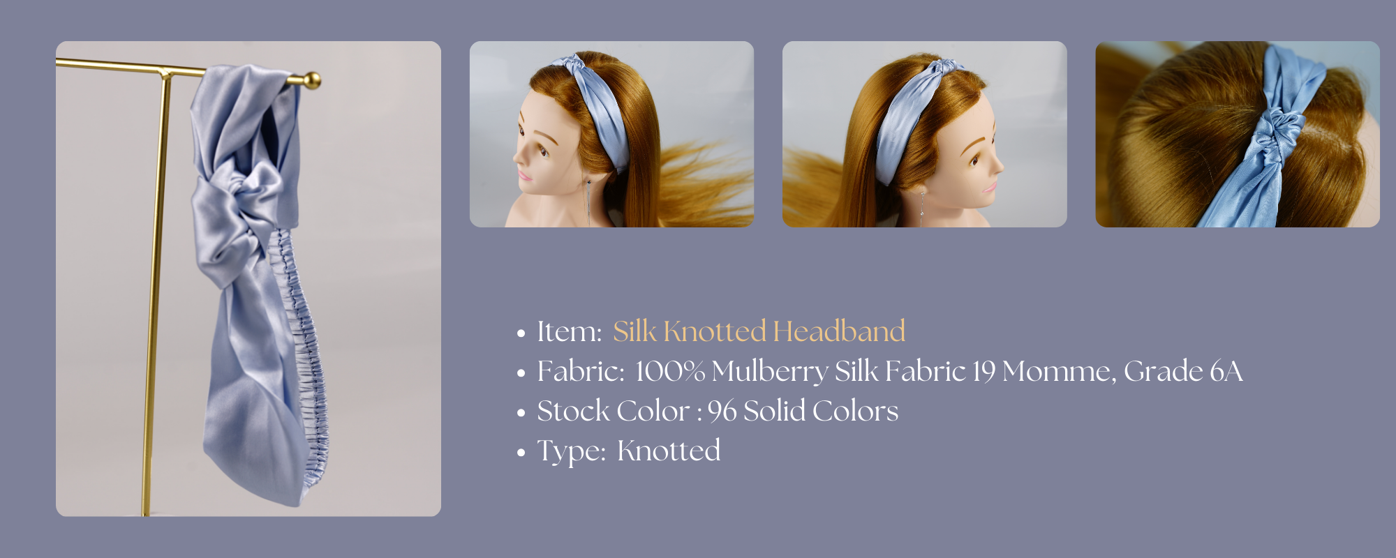 Experience elegance with our silk knotted headband, available in 96 stocked colors. Crafted from the finest silk, these knotted silk headbands offer both style and comfort. Our services include custom silk headbands with low minimum orders and wholesale with no minimum requirements, plus custom brand labels, logo embroidery, and printed designs, with extra costs.