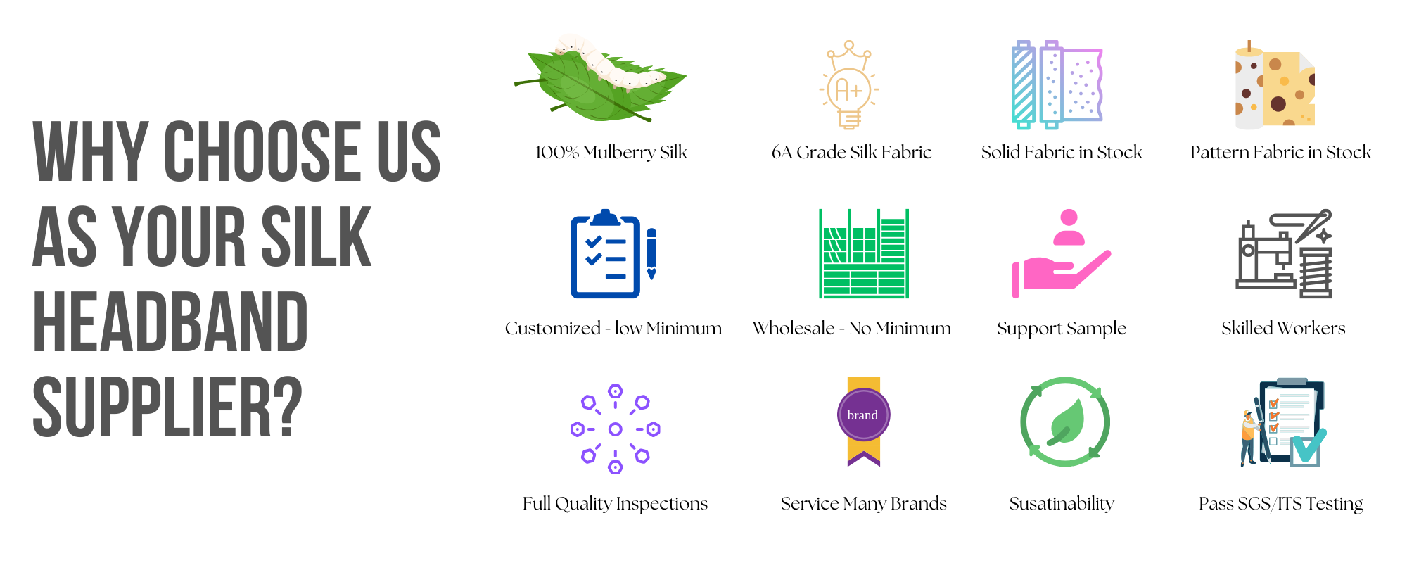 - Custom pattern silk hair band : Recommend order 1 pattern for your all silk products to make each products have low MOQ.