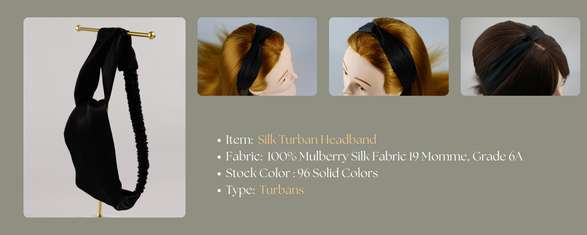 Our Silk Turban Headband is the perfect accessory for those who value luxury and style, available in 96 vibrant colors. Made from high-quality silk, these mulberry silk headbands offer both beauty and comfort. Our services include custom silk headbands with low minimum orders and wholesale with no minimum requirements, plus custom brand labels, logo embroidery, and printed designs, with extra costs.