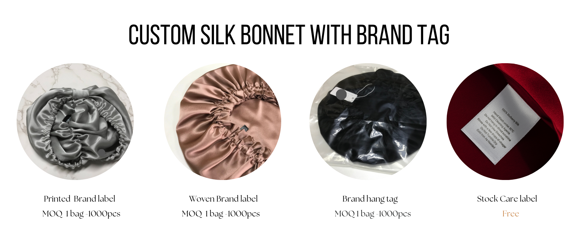- Logo embroidered silk bonnet: MOQ request 20 pieces per color per size at least. To have competitve price, we recommend you order 50pieces per color per size.