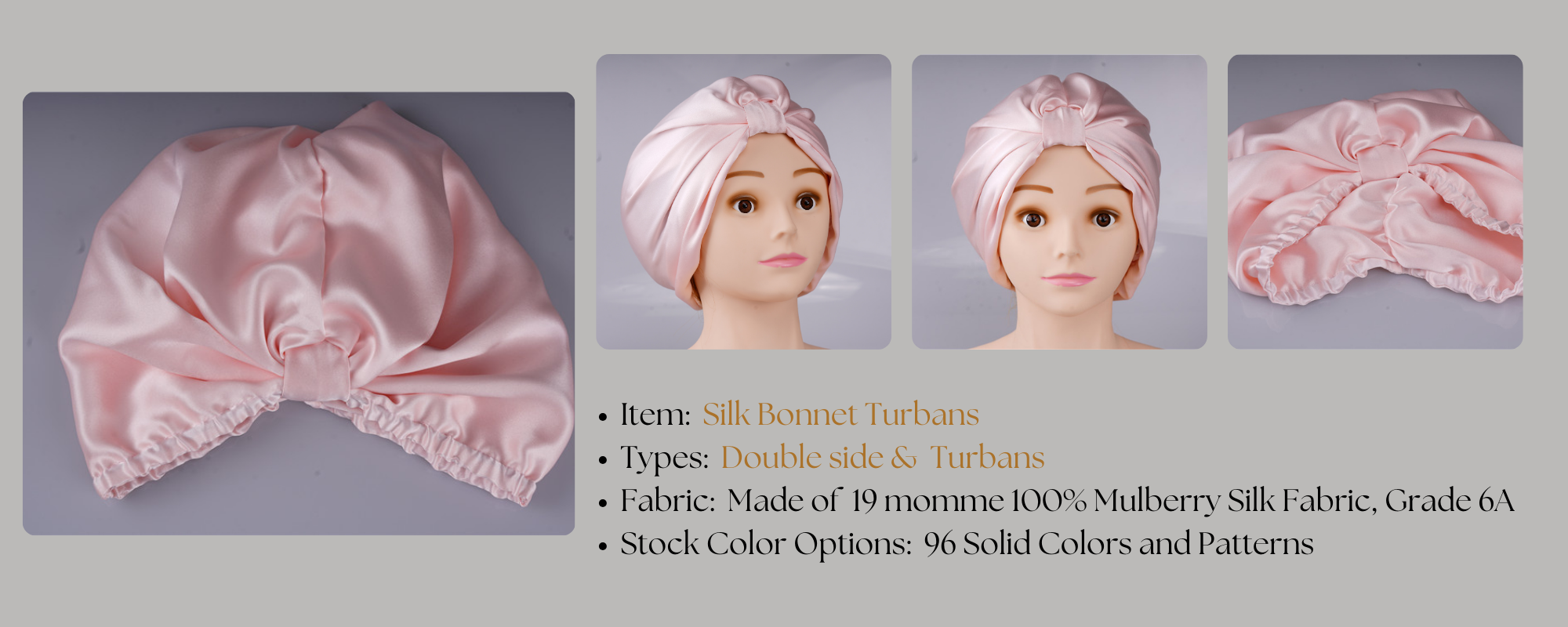 Indulge in the luxury of our Silk Turbans Double Side. Available in 96 stock solid colors, these sleep turbans silk provide a comfortable fit and superior hair protection. Our services include custom silk bonnets with low minimum orders, silk bonnets wholesale without minimums, support custom brand labels, logo embroidery, and printed designs, with extra cost.