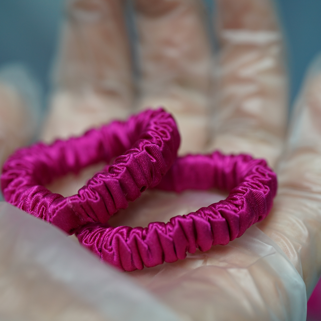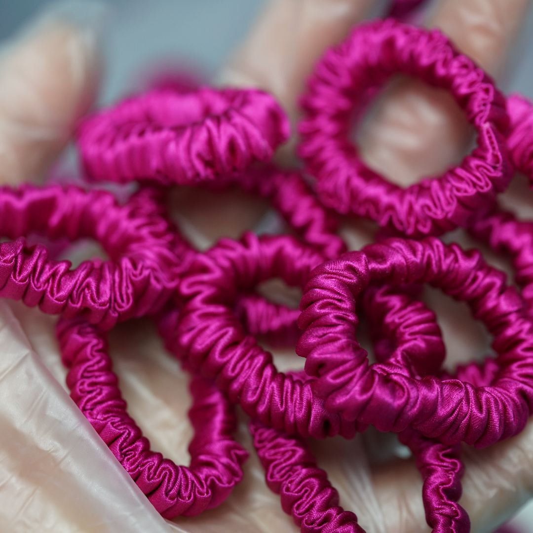 The tiny silk scrunchie is a downsized version of the standard skinny silk scrunchie, offering a refined styling option for adults and a practical choice for children's everyday hairdos. The Deep Rose Pink silk scrunchie is currently in stock and available for wholesale, with no minimum order required for premium mulberry silk scrunchies.