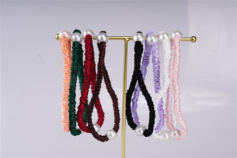 This is NEW Long mini silk scrunchies which use doule quantity silk fabric than classic style mini silk scrunchies. Silk hair scrunchies quality still in 100% mulberry silk 19 momme grade 6A. This long silk scrunchies design for the one who wanna suitable for any hair volume like thin hair or thick hair, straight hair or curly hair, never worried about the scrunchies elastic band size small or big. We use ABS pearl as the joints to fix scrunchies in suitable size which you need.