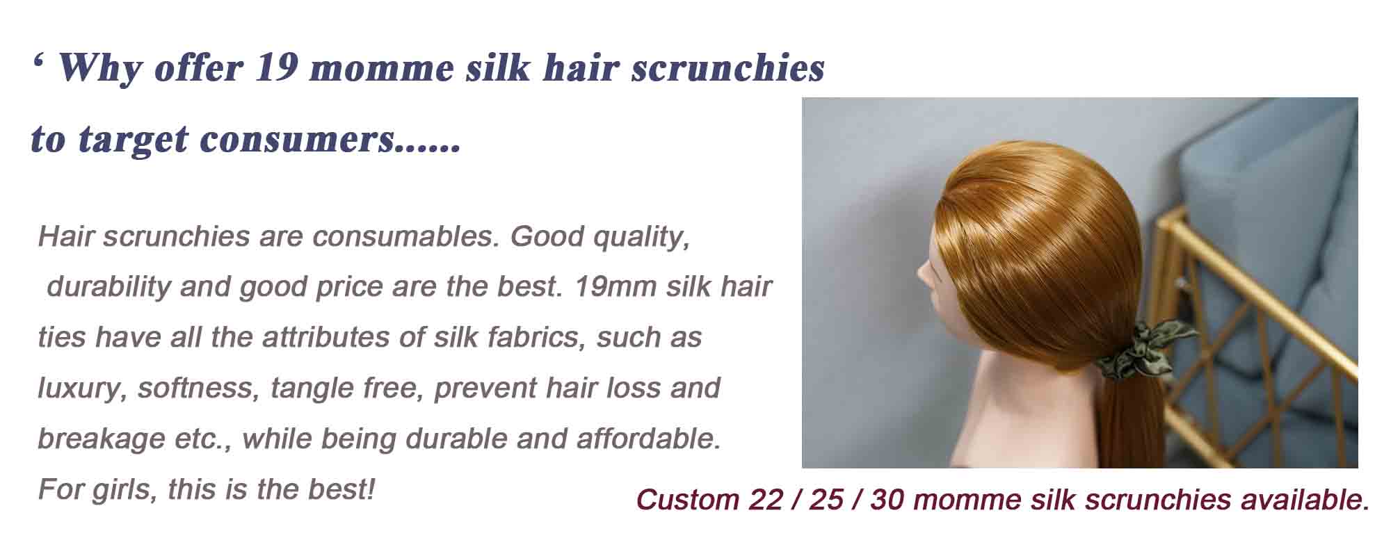 - Custom silk scrunchie : Pay customized brand label cost - pure silk hair scrunchies without MOQ; Pay customized brand hang tag cost - silk hair ties without MOQ.