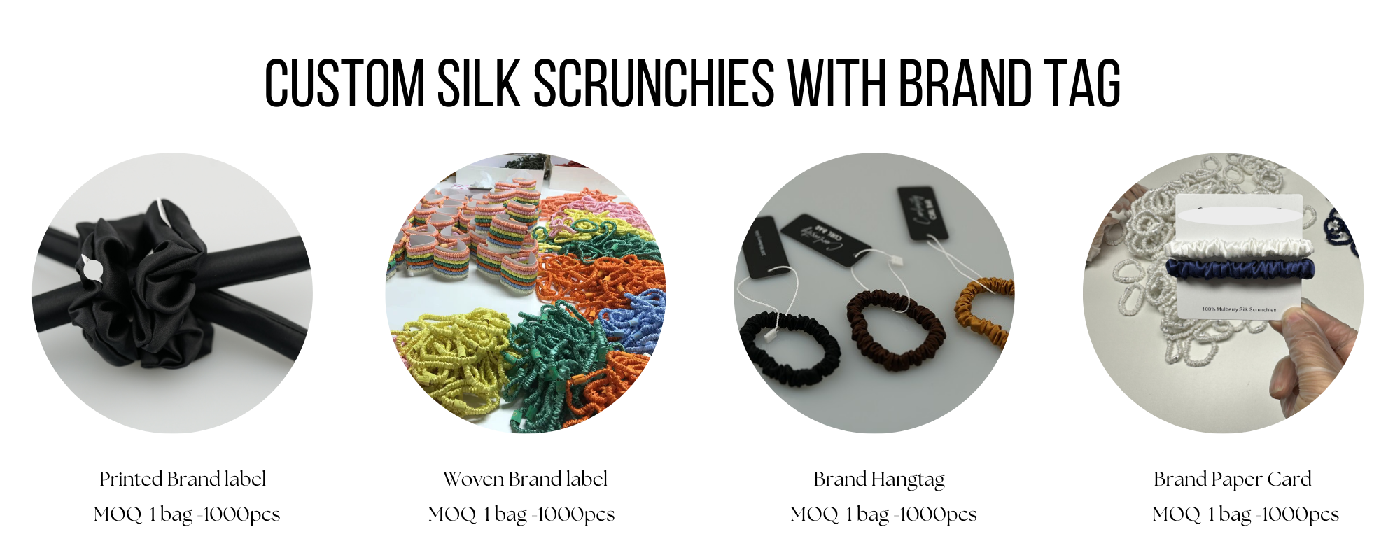 - Customized silk scrunchie with brand tag : Pay customized brand label / hangtag cost - silk scrunchies without MOQ;